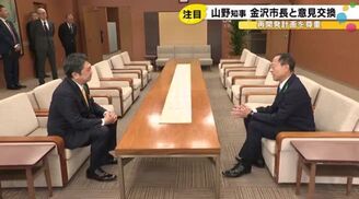 知事就任後初めて、山野知事が金沢市の村山市長を訪問しました。かつては11年間市長をつとめた古巣を訪れた山野知事。金沢市都心部の再開発などについて村山市長と意見を交わしました。